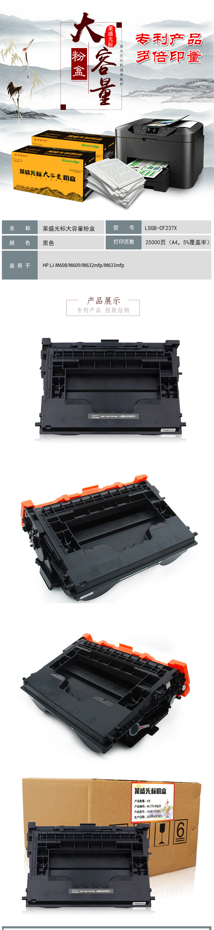 萊盛光標(biāo) LSGB-CF237X 硒鼓粉盒(4支裝)大容量HP LJ Enterprise M607/M608/M609 MFP M631/M632/M633
