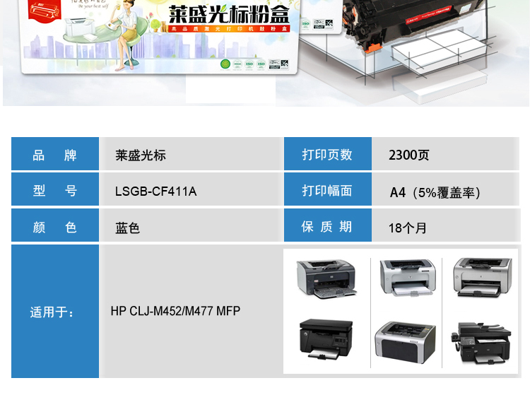 萊盛 光標LSGB-CF411A彩色墨粉盒適用于HP CLJ-M452/M477 MFP 藍色