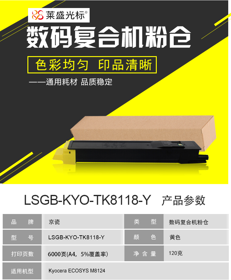 萊盛光標 LSGB-KYO-TK8118-Y 硒鼓數碼粉倉 適用于Kyocera ECOSYS M8124 黃色