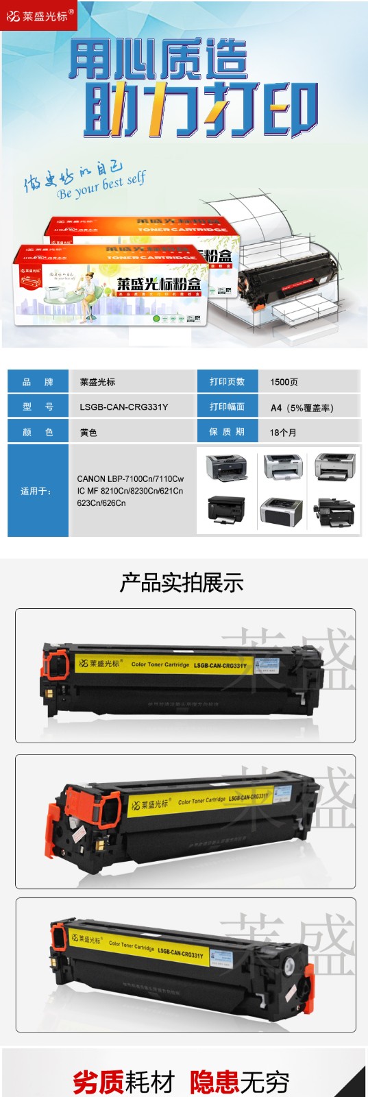 萊盛光標LSGB-CAN-CRG331Y 黃色粉盒 萊盛佳能LBP-7100Cn/7110Cw IC MF 8210Cn/8230Cn/621Cn/623Cn/626Cn黃色粉盒