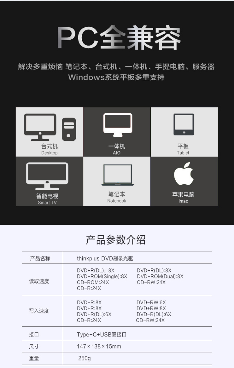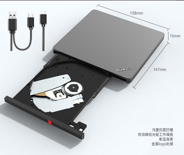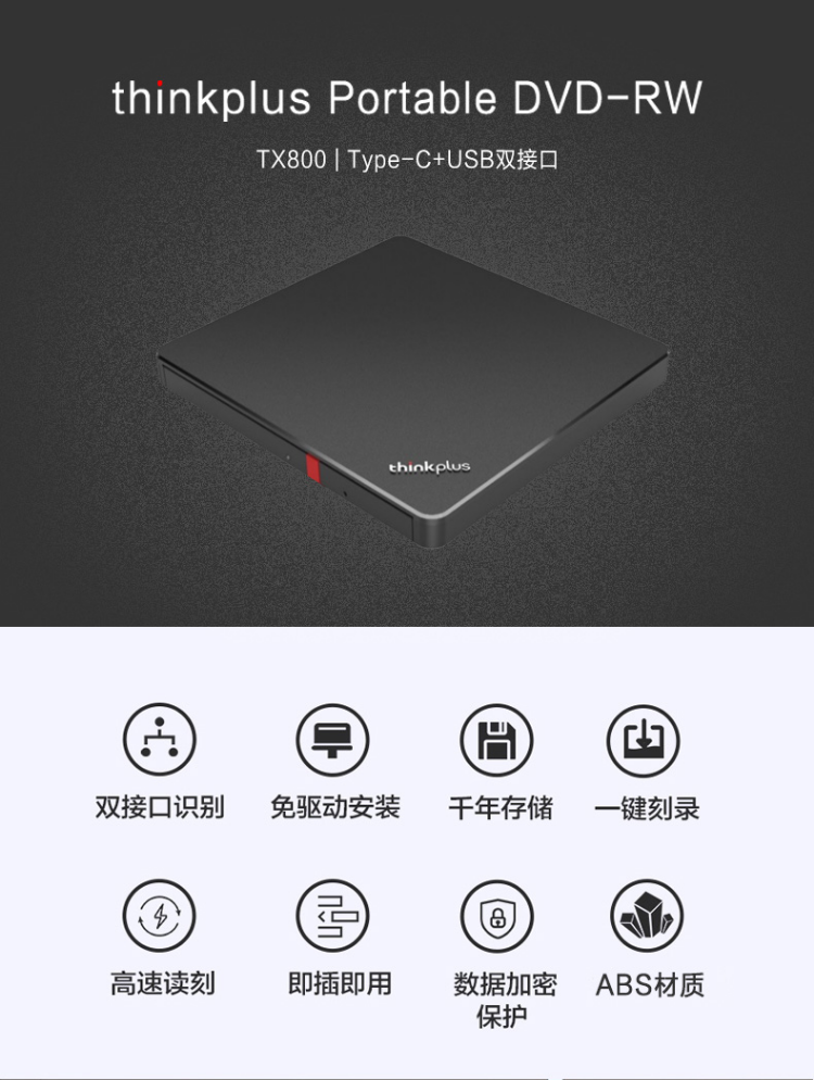 聯想 TX800 外置光驅 超薄外置DVD刻錄機 24倍速 高速移動光驅 Type-C+USB雙接口/1年保修