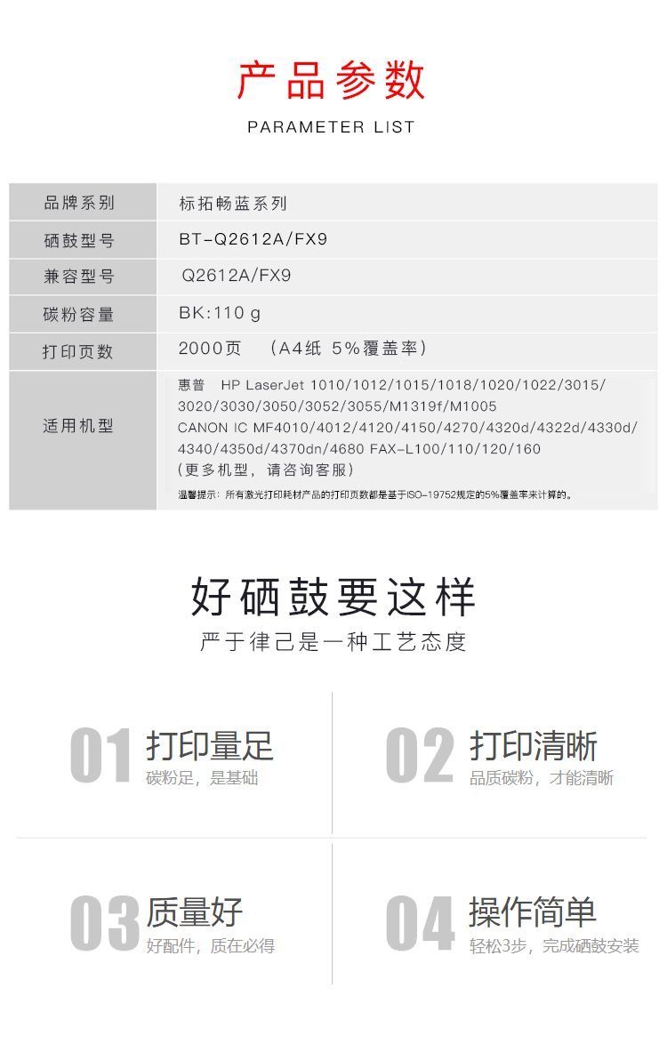 標拓 BT-Q2612A硒鼓適用惠普HP1018/1020plus/1022/3050/M1005/M1319f/LBP2900打印機 暢藍系列