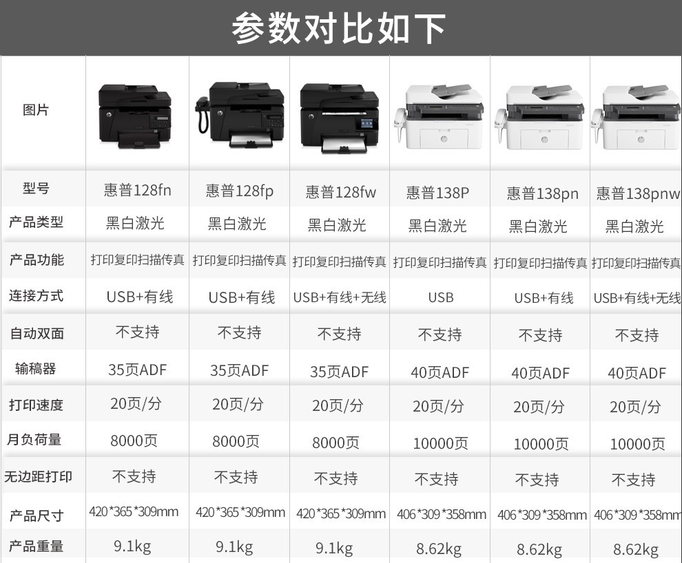 惠普 打印機 128fn/fp/fw/138pnw a4黑白激光打印機復印掃描傳真一體機 辦公家用 M128fw 打印/復印/掃描/傳真